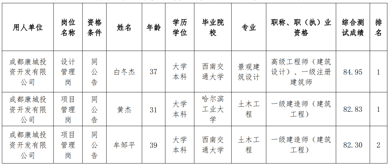 根據(jù)成都九聯(lián)投資集團(tuán)有限公司2025年8月25日發(fā)布的招聘公告及招聘相關(guān)規(guī)定,經(jīng)資格審核、筆試、面試、背景調(diào)查、體檢等程序,現(xiàn)將擬聘用人員名單公示如下: